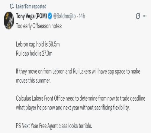 湖媒Tony Vega写道:2026年夏詹姆斯可以释放5950万的空间,八村垒则可以释放2730万的空间,如果湖人不再留用詹姆斯、八村,那么湖人在2026年夏就有足够的薪金空间来运作。